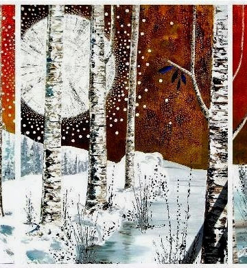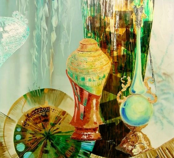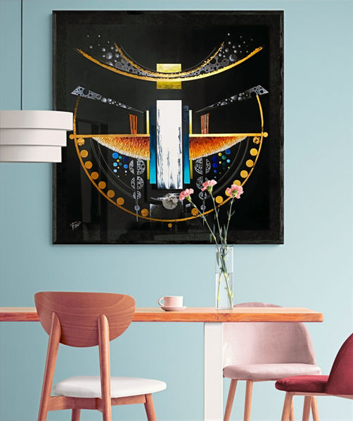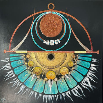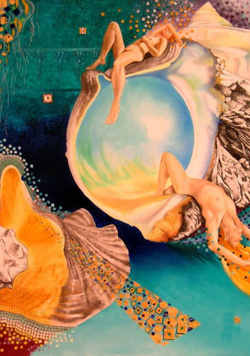 Huiles sur toile de lin, feuille d'or 24cts, perles